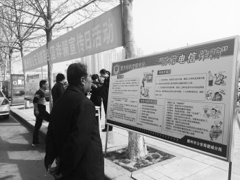 29日上午,德州市公安局在中心广场进行防电信诈骗宣传活动,普及防电信诈骗常识。 本报记者 张磊 摄
