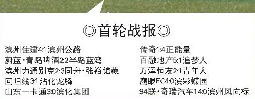 首场比赛为滨州住建与滨州公路的精彩对战,滨州住建42号球员徐海涛在上半场第40分钟攻入本次联赛的第一个球,最终滨州住建4:1大胜滨州公路。剩余18支足球队伍分别在28日和29日完成了第一轮的角逐。
