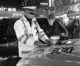 ◤民警在对违法占道停车待客的出租车司机进行处罚。