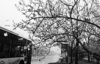 天衢东路上的公交站点候车厅在近期安装到位,3月31日,在繁花掩映下的一处公交站点,市民避雨候车。 本报记者 马志勇 摄