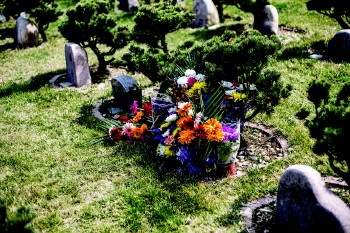 3月30日,在福宁园,一捧鲜花摆放在一位逝者的石碑前。