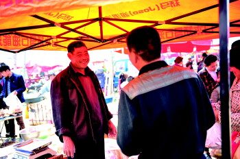 李金锋(右)与一位摊主打招呼,融洽的群众关系也非常利于他的行动。