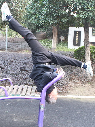 时间:2015年2月14日 自述:这位大爷身手果然不凡,运动器械上玩起了倒立。 点评:真是老当益壮啊!