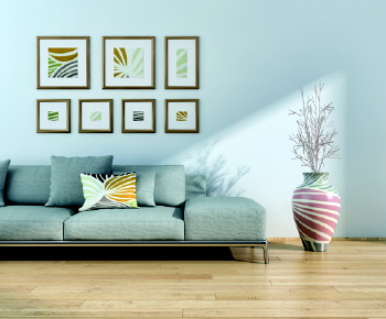 小面积客厅,不易使用深色系,灰色系沙发让小巧的客厅空间变得明亮,简约时尚的家具可以避免装饰繁琐,大客厅家具的笨重。灰蓝色的布艺沙发,暖色花纹的抱枕,风格一致的装饰画和花瓶,温和的颜色能够让人舒服耐看,拿起相机,随手一拍,便是一幅完美的静物画。布艺沙发朴素干净,是简约风格家居必备的元素。布艺和木头的搭配也是天作之合,浅色布艺沙发搭配浅色系地板,显得格外柔和。
