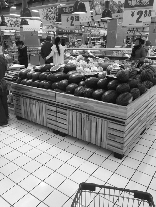 之后记者又来到了附近的一家大型购物超市,在超市里有三个品种的西瓜,有缅甸西瓜、特小凤西瓜和黑美人西瓜,售货员告诉记者黑美人西瓜销售量最高,产地也是海南万宁,超市检测系统很严格,中毒现象不可能出现。记者随机采访了几位顾客,其中一位女士告诉记者,她看到过这个新闻,自己现在不敢吃西瓜了,也告诉家里人不要再买西瓜了。但大部分顾客还是表示自己并不知道这个情况,吃了也没有出现什么问题。