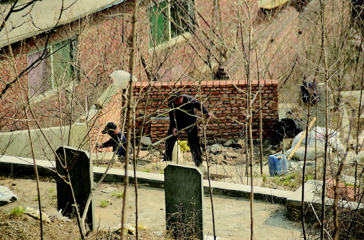 ◤3月30日,在济南的一处坟场,几位村民正给一片宗族坟地修砌院墙。