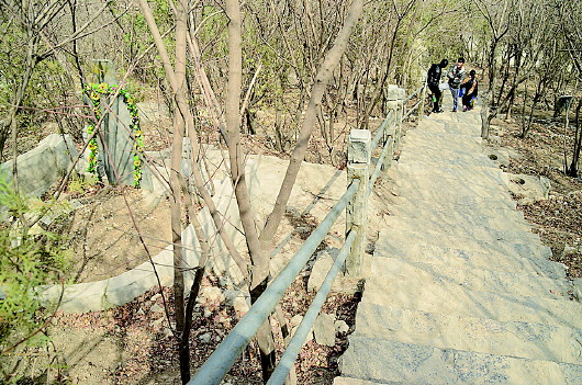 “怎么走着走着就进了墓地?”3月30日,在济南英雄山风景区东侧山体,几位市民抱怨着。顺着山道从文化市场上面的山体一路向东,就会遇到一片墓地。这片墓地将附近唯一的山道包裹其中,游客想通过必须穿过坟场。墓地中大约有近百座坟头,大部分都立上了墓碑。虽然坟地规划整齐,设计精良,但很多游客还是感到不自在,纷纷快步通过。