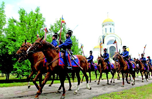 2012年8月,莫斯科街头一队哥萨克骑兵身穿传统制服进行和平游行,庆祝反拿破仑战争胜利200周年。