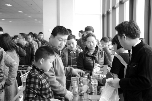 ▲在交易中心收银处,等待结账的顾客排起长队。