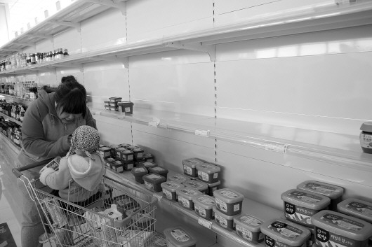 ◥4日上午,济南保税区国际商品交易中心众多商品被抢购一空,许多货架都空了出来。