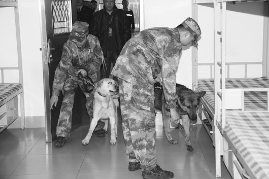 在清查现场,记者看到有两只缉毒犬在训导员的带领下搜查毒品。这两只缉毒犬分别是东德牧羊犬和拉普拉多犬。在对戒毒场所进行毒品清查之前,警犬训导员对受训的缉毒犬进行了阶段训练,保证缉毒犬有突出的衔取欲望和游戏欲望。