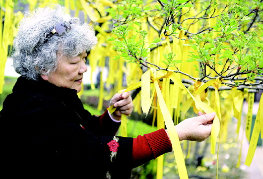 4日,英雄山烈士陵园的纪念堂前,大批市民在填写黄丝带,表达对故人的哀思,附近的小树上挂满了飘逸的黄丝带,寄托着一份份深深的思念。截止到下午4时,烈士陵园共免费发放黄丝带3500多条。 本报记者 周青先 通讯员 丁雁彪 摄