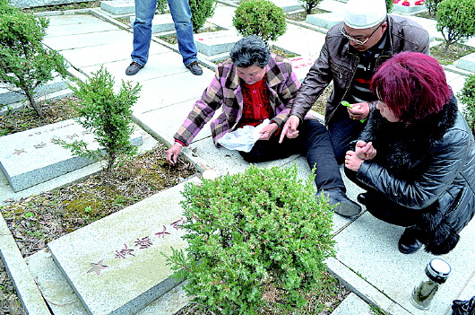 随后,陈安英又拿出随身带的一抔曲阜的黄土,撒在袁绪义的墓碑旁,再从这里挖出一个小土块,准备带回去。