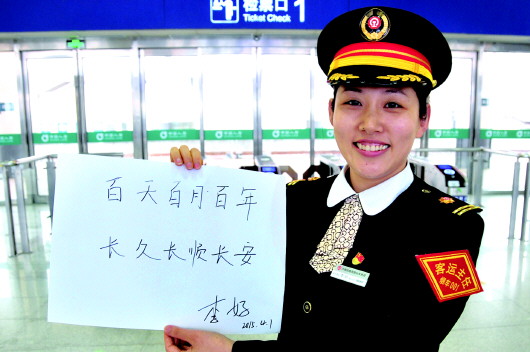烟台南站工作人员对城铁的祝福。 本报记者 吕奇 摄