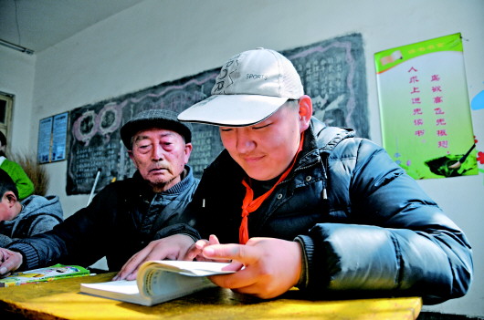 8日上午,在邹城市香城镇莫亭小学五年级一班,祖孙两人同桌学习。小思众患有自闭症,爷爷为了让孙子能和正常孩子一样认字看书,陪读了五年。 本报记者 李岩松 摄