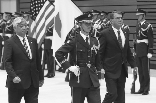 4月8日,日本防卫大臣中谷元(前左)在东京欢迎到访的美国国防部长卡特(前右)。 新华/路透