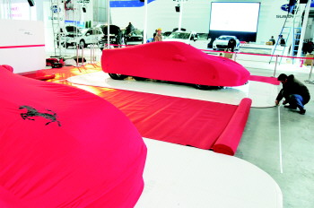 玛莎拉蒂等豪车云集 工作人员忙着布展