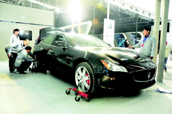 8日,车展开幕在即,工作人员在为一辆玛莎拉蒂调整位置。 本报记者 吕奇 摄