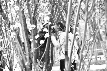 最近春暖花开,不少市民走出家门赏花,但上树、折花等不文明现象也不少。图为一位小朋友爬上一棵开满花的树,孩子家长在一旁给他拍照片。 本报记者 邹俊美 摄