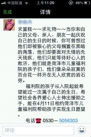 本报菏泽4月8日讯(记者 周千清) “福利院的孩子们入院起就希望能过一次属于自己的生日,希望社会各界爱心人士能伸出援助之手……”近日,一个呼吁爱心人士为福利院孩子们过生日的微信在朋友圈悄悄流传,这是菏泽儿童福利院的老师为孩子们发出的愿望,短短几日,就得到微友们的广泛响应,献蛋糕、送礼物,大家相约4月11日,代替抛弃他们的父母,为孩子们过一个属于他们的生日。
