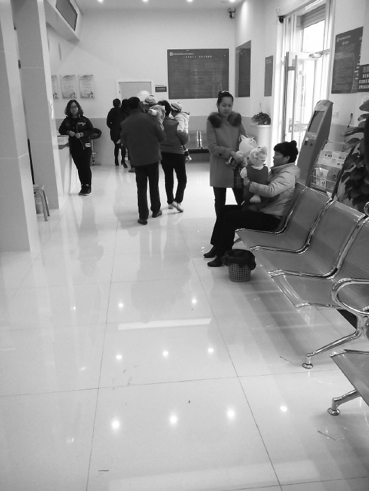 家长和孩子在留观区等待,门口就是取号机。 本报见习记者 傅浩 摄