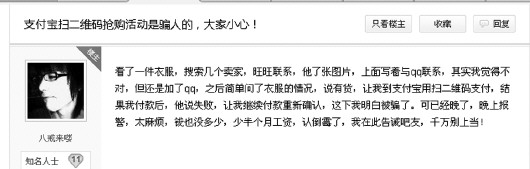 7日,市民王女士通过淘宝买鞋子,然而淘宝买家却告诉她,鞋子淘宝已经没货了,并让她加一QQ号。随后,网名为“正品代购”的QQ号便给王女士发来一支付宝付款的二维码,感觉事情不对的王女士并没有立刻付款,网上一查,被骗的网民已不在少数。