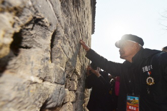 4月8日,是台儿庄大战胜利77周年的日子,从全国各地赶来的参战老兵、亲属及后人、大战亲历者和社会各界人士,来到大战遗址台儿庄,为长眠在此的英烈献花,祭奠缅怀革命先烈。图为在台儿庄大战遗址,邵经斗老人抚摸着墙上的弹孔热泪盈眶。 本报通讯员 高启民 摄影报道