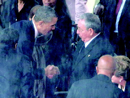 2013年12月,奥巴马(左)在南非参加已故南非前总统曼德拉的追悼会时,与劳尔·卡斯特罗握手。