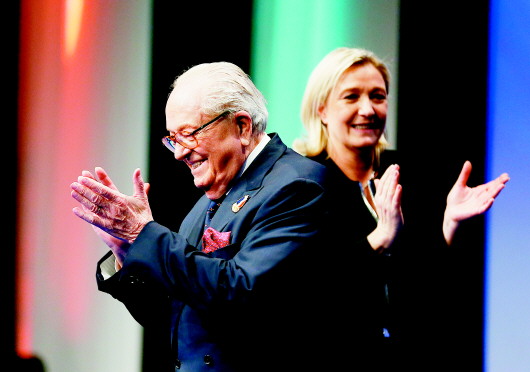 2014年11月30日,父亲让-玛丽·勒庞(左)在党派会议上与女儿玛丽娜·勒庞(右)共同庆贺她连任国民阵线领袖。