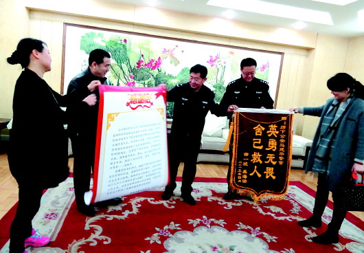 4月9日,落水孩子的两位家长来到历下区公安分局,给马警官送去了锦旗和感谢信。“英勇无畏,舍己救人”,署名是两个孩子,“我们想着用孩子的名义给马警官送锦旗,让孩子能牢牢地记着马叔叔。”