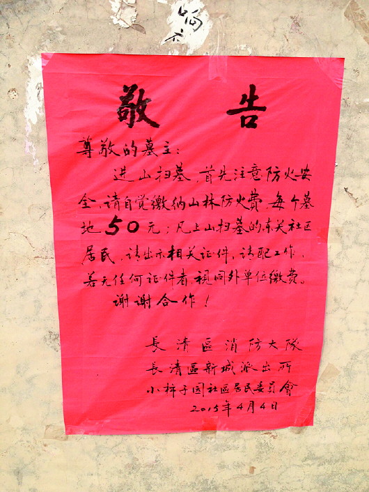 小柿子园公墓位于社区内的长清山上,依山而建,现有墓穴一千多座。记者在墓地东侧入口看到,除了周围贴有文明祭扫的相关标语外,现场没有任何标识能够说明此处是墓地。入口的两扇大门紧闭,在门口贴有一张手写的《敬告》,内容大致为:非本地居民进山扫墓,请自觉缴纳50元山林防火费。《敬告》落款单位依次是长清区消防大队、长清区新城派出所、小柿子园社区居民委员会。