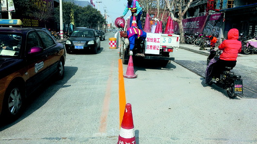 7日,在章丘市明水街道山泉路大润发路段,施工人员正为道路中央隔离护栏施划标线。日前,该路段新安装了隔离护栏,避免此前车辆随意调头、行人随意穿行马路所带来的安全隐患和车流迟滞。然而,记者了解到,该举却引来周边部分商铺的争议。