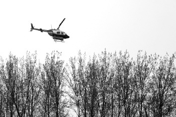 9日上午,任城区林业飞机防治现场,伴着“轰隆隆”的声响,直升机平缓飞到杨树上空10米左右,操作人员打开药剂阀,从喷头喷出白色的药剂,在机尾拉出一条弧线,散落在叶片之上。