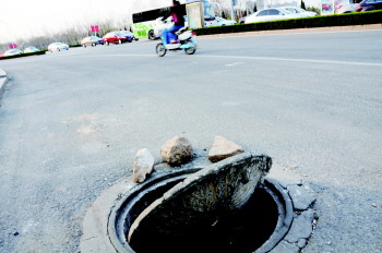 4月9日,在东方红路与广川大道路口转弯处的一个窨井盖破损,存在安全隐患。 本报记者 马志勇 摄