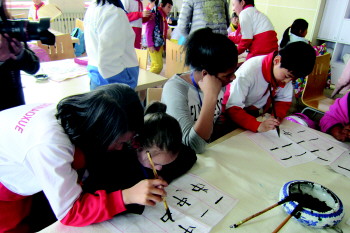 9日,来自美国康州凯灵顿小学的师生访问团走进友好学校青岛市实验小学,师生了解了市实验小学的校园文化,深入课堂,参与大课间,还学习了剪纸、书法两门特色校本课程。