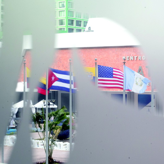 这是4月9日在巴拿马城拍摄的第七届美洲峰会会场外飘扬的美国国旗(右二)和古巴国旗(左二)。 新华社发