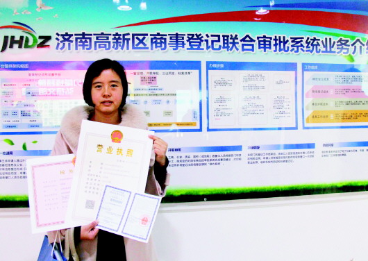 4月3日上午,济南市高新区行政审批服务大厅“三证联办”窗口,宋玉莲欣喜地从工作人员手中接过联办的三个证,感慨道:“效率提高太多了,以前是工商、公安、质监、税务分着跑。填写大量的表格、提交复印件,来来回回跑很多趟。现在只用把材料一并提交之后,等待预审。预审通过之后交一些材料,顺利的话,三四天就能过来拿这三个证了。”