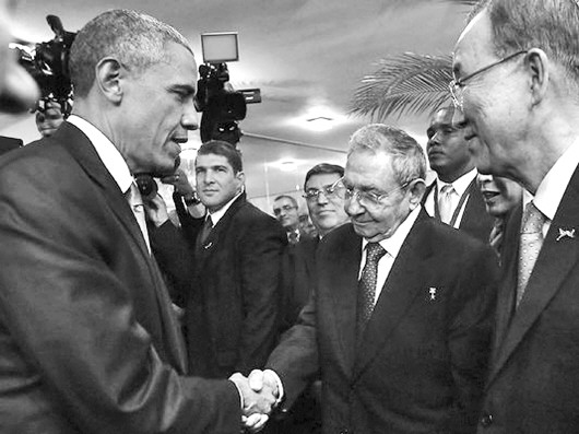 奥巴马和劳尔·卡斯特罗上一次握手还是2013年底在南非前总统纳尔逊·曼德拉的葬礼上。劳尔·卡斯特罗当时报以微笑。