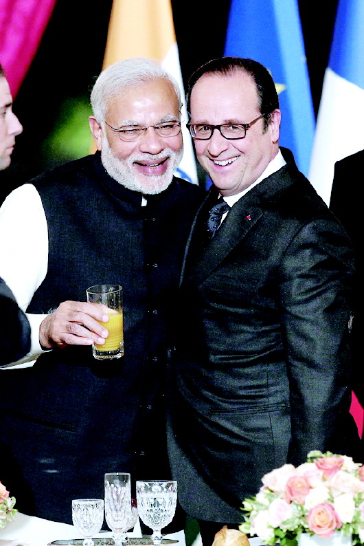 4月10日,奥朗德(右)与到访的莫迪出席国宴。 新华/法新
