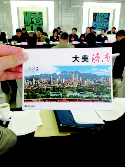 会议现场港澳委员获赠济南风光明信片,招商引资背后还有文化交流。 本报记者 王皇 摄