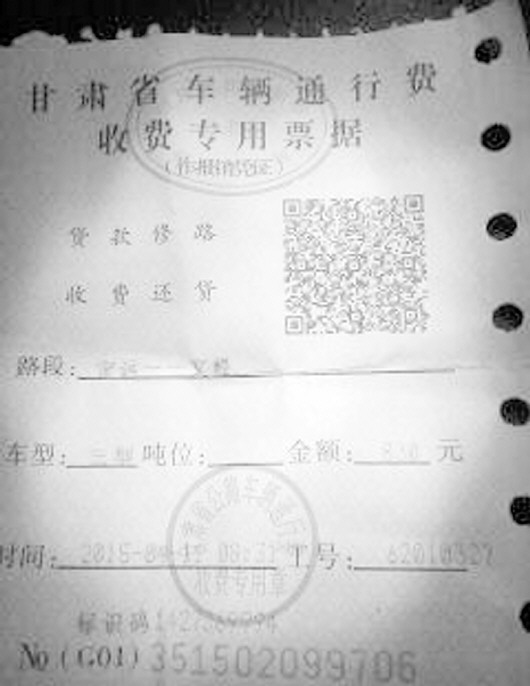 考虑到返程太麻烦,回到服务区也不一定能开到凭条,丁孝合无奈之下支付了700元罚款。“加上这段路程正常费用130块钱,一共交了830元钱,这趟活算是白干了。”值得注意的是,甘肃当地给丁孝合出具的收费凭据只包含了收费数额,并未注明因超时所收。