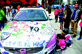 在有着“红宝石”美称的豪车馆东侧,4辆沃尔沃轿车一字排开,本报小记者汽车创意涂鸦活动正在进行。本报小记者个个摩拳擦掌,准备给靓车化妆。