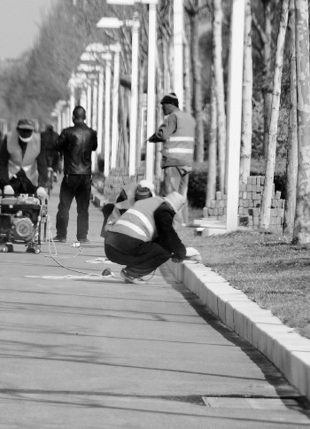 ◤4月12日,三八东路上,为美化道路设施,工作人员在路边石阶打磨美白。 本报记者 马志勇 摄