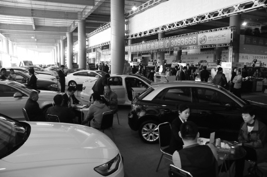 车展现场,不少市民在展厅内与汽车销售员交流。 本报记者 李运恒 摄