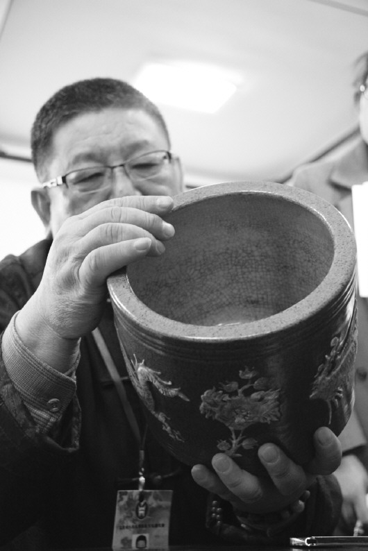 专家姚成对瓷瓶进行鉴定。 本报记者 王晓霜 摄