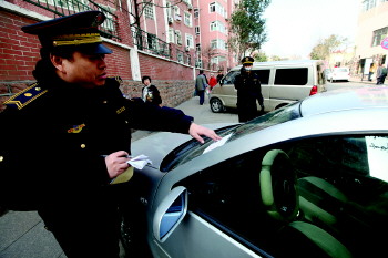 城管执法人员对一辆停在人行道上的私家车张贴罚单。