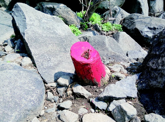 接到群众举报后,华山管委会立刻做出了反应。工作人员到现场查看,发现在华山西侧山体滚石沟的上方,有两棵柘木被砍伐了。当天,管委会就采取了措施,把附近的三棵柘木树身涂上红漆,在旁边的石块上用红色油漆写上了警示标语“禁止砍伐”。