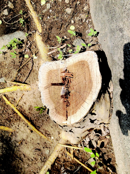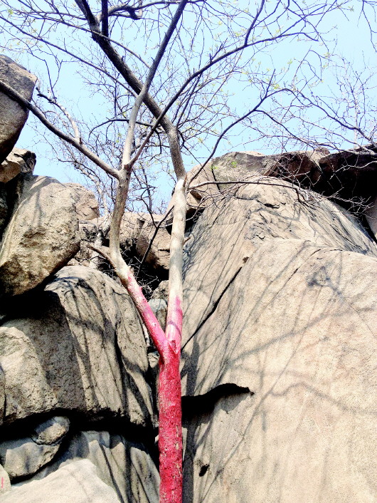 柘树被砍伐后,华山工作人员涂上了一层红漆。