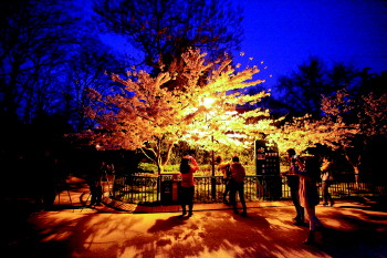 14日晚7点,在中山公园樱花路上,路灯下的樱花树展现出与白天不同的美,不少摄影爱好者支起了“长枪短炮”在树下拍摄夜樱,散步的市民也拿起手机拍照留念。