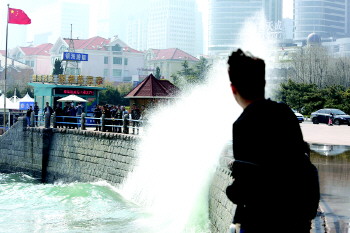15日,五四广场海域不时激起阵阵大浪,不少路人驻足观望。当日,青岛市气象局发布大风蓝色预警信号。预计未来受北方冷空气影响,岛城南风转北风陆地可达5—6级阵风8级,近海6—7级阵风9级,海上7—8级阵风10级。